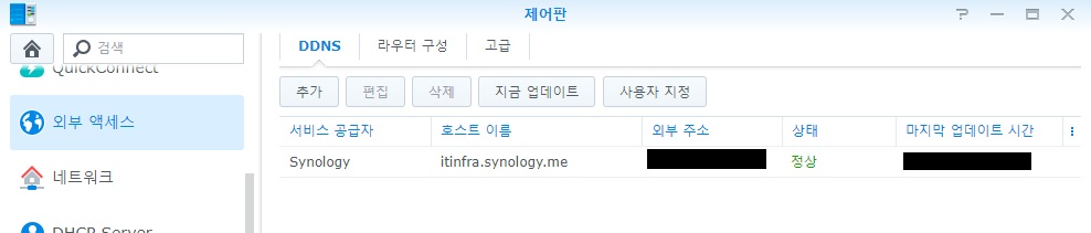– NAS 제어판 > 외부 엑세스에서 DDNS 설정