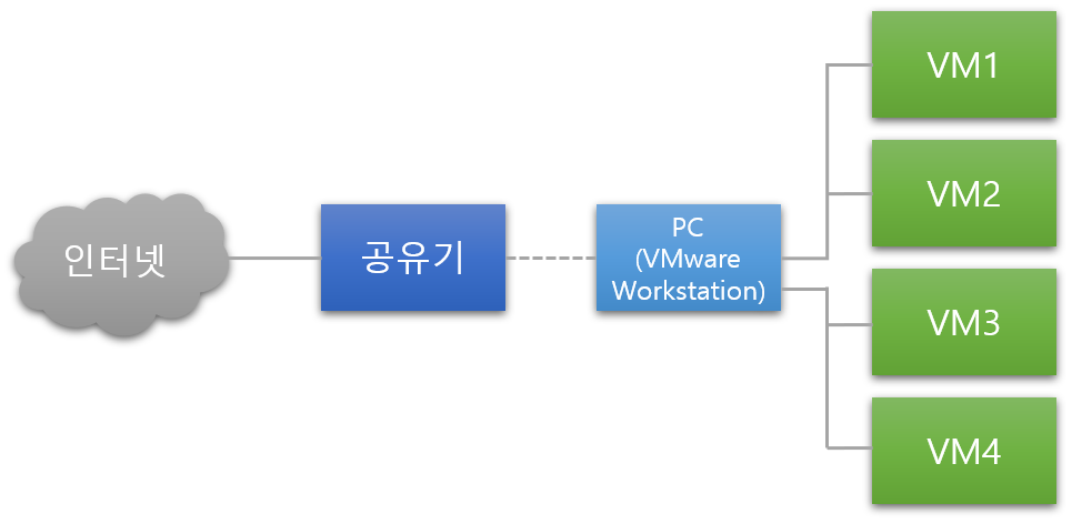 공유기를 통하여 인터넷이 연결된 PC에 VMware workstation(이하 워크스테이션)이 설치되어 있으며 각 VM(가상머신)은 네트워크 연결하지 않은 상태 입니다.